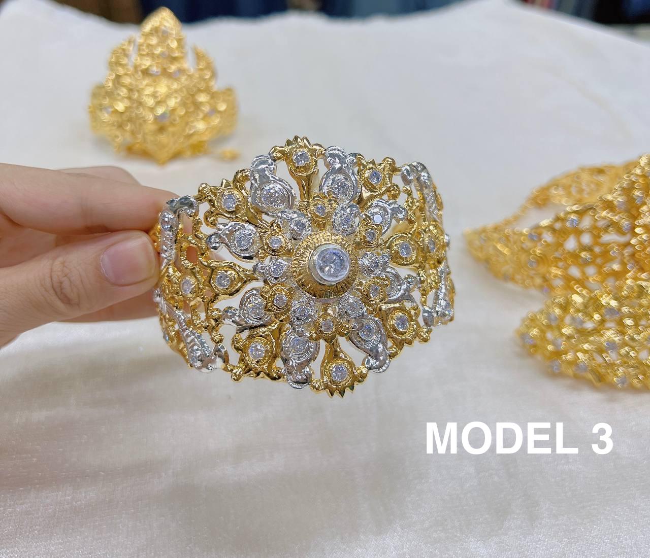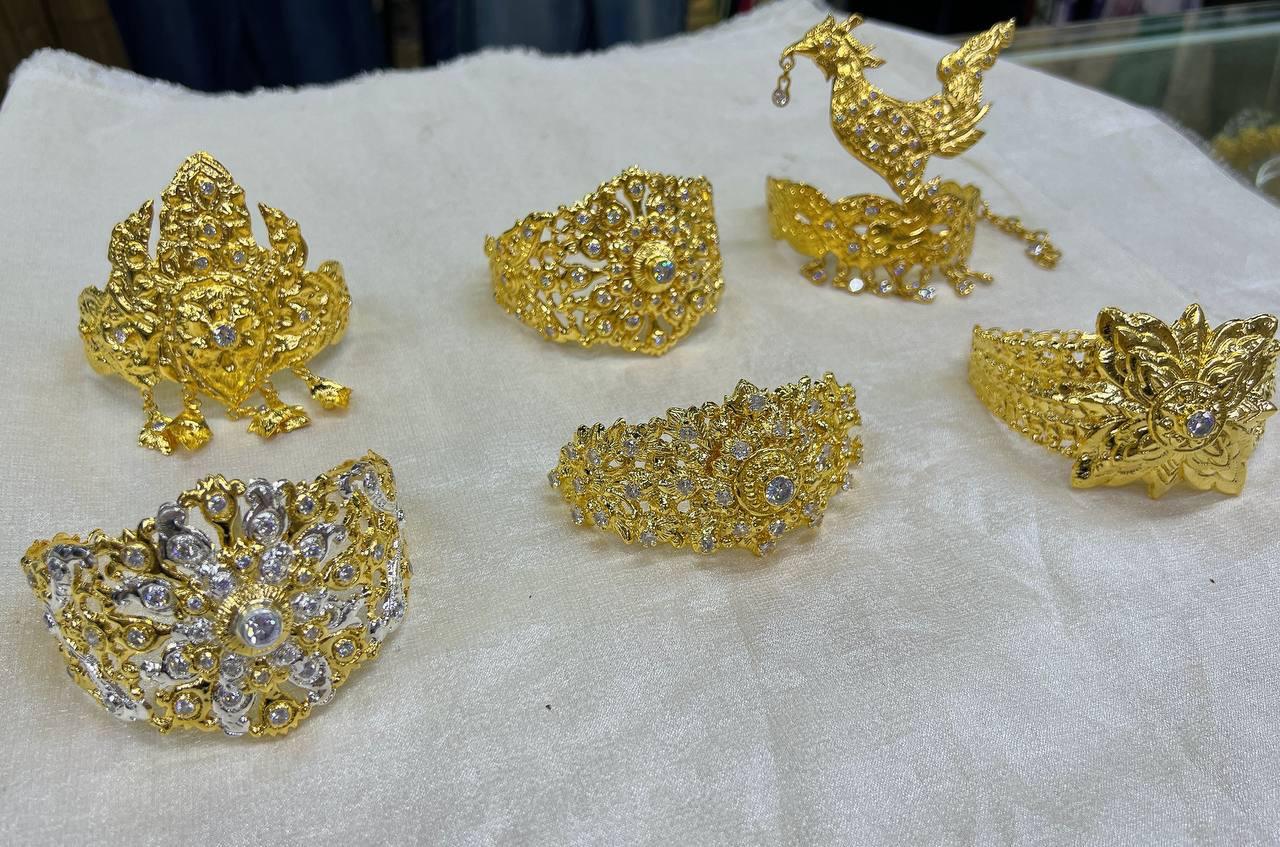 Façonnées à la main au Cambodge, ces manchettes capturent l'élégance traditionnelle khmère avec leurs motifs floraux délicats et pierres étincelantes.