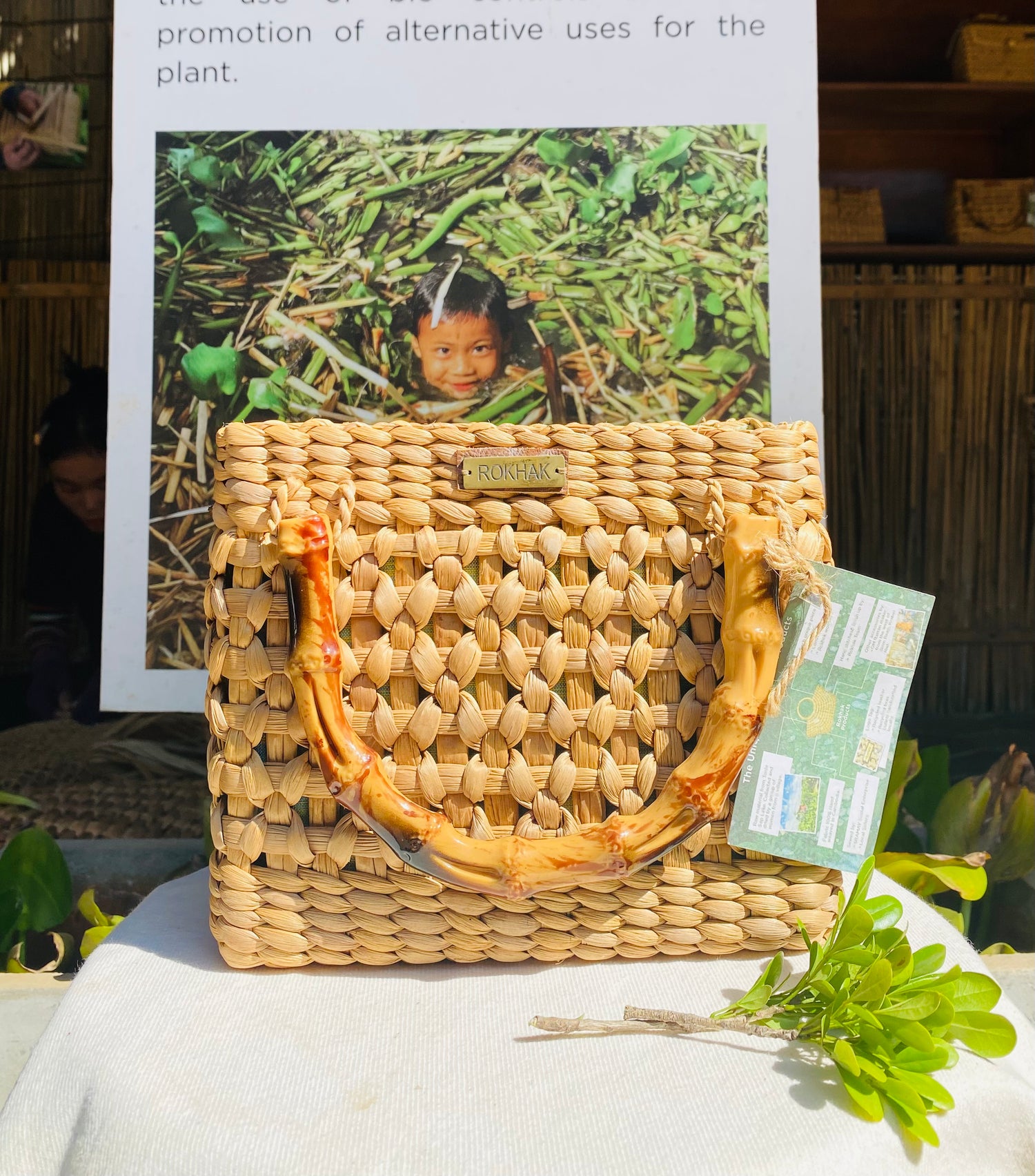 Rokhak est une initiative sociale cambodgienne née à Siem Reap pour transformer l'eau de jacinthe (une plante invasive qui étouffe les lacs) en trésors artisanaux.