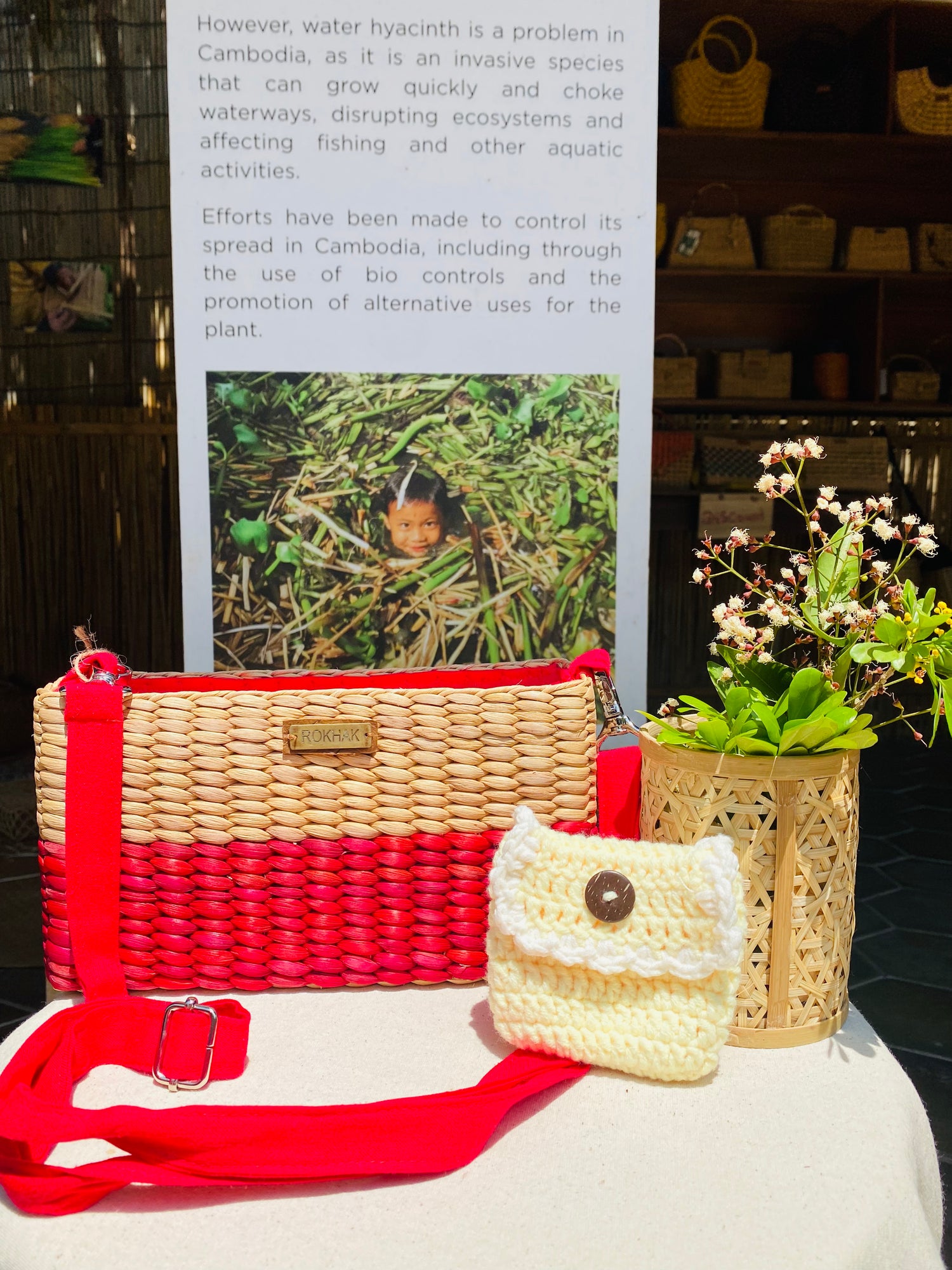 Rokhak est une initiative sociale cambodgienne née à Siem Reap pour transformer l'eau de jacinthe (une plante invasive qui étouffe les lacs) en trésors artisanaux.