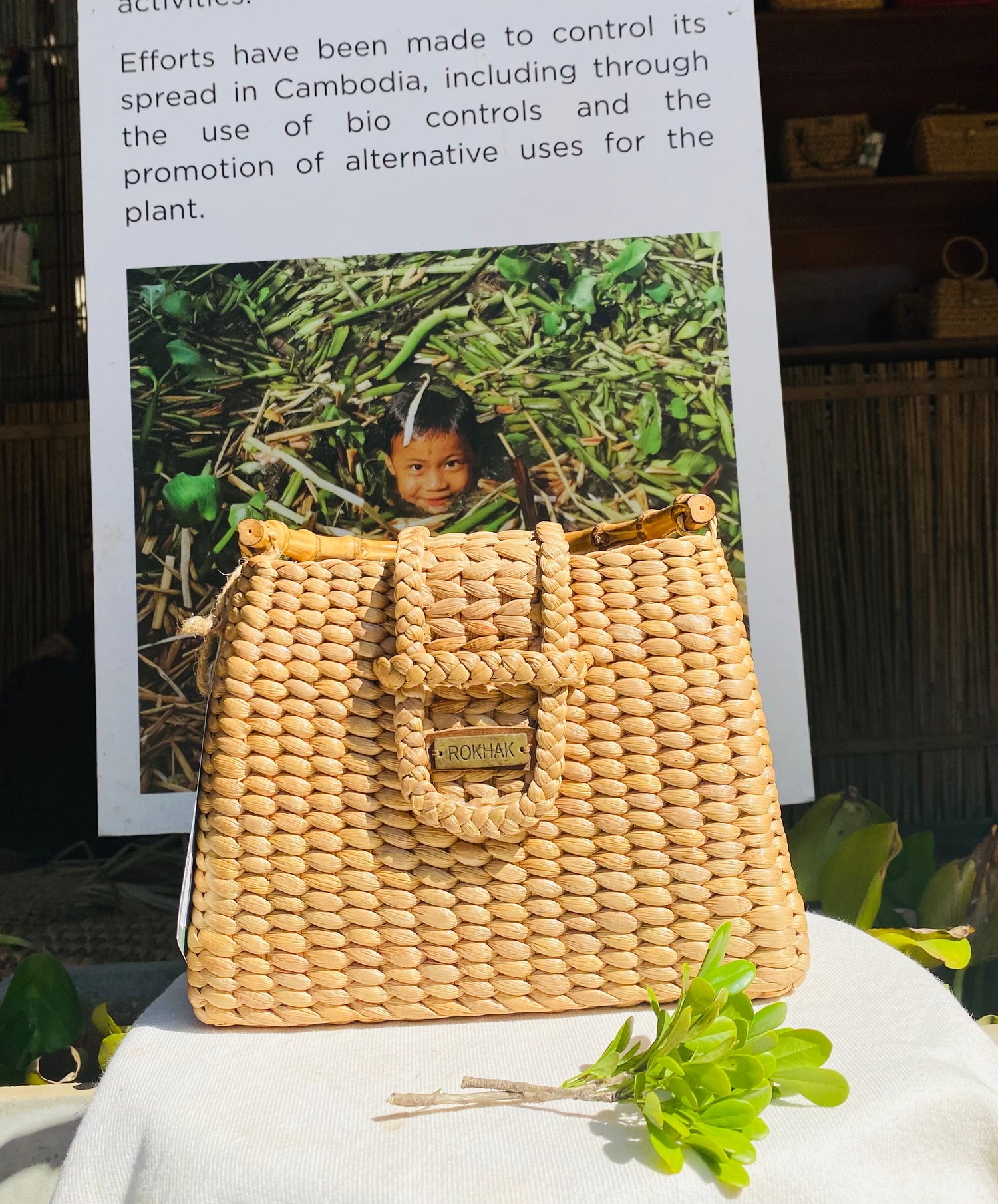 Confectionné à la main en jacinthe d'eau, plante aquatique récoltée et séchée à la main au Cambodge, tressée selon des techniques traditionnelles transmises de génération en génération, ce sac est créé par des femmes artisanes de Siem Reap, formées et soutenues par Rokhak, entreprise sociale cambodgienne fondée en 2016.