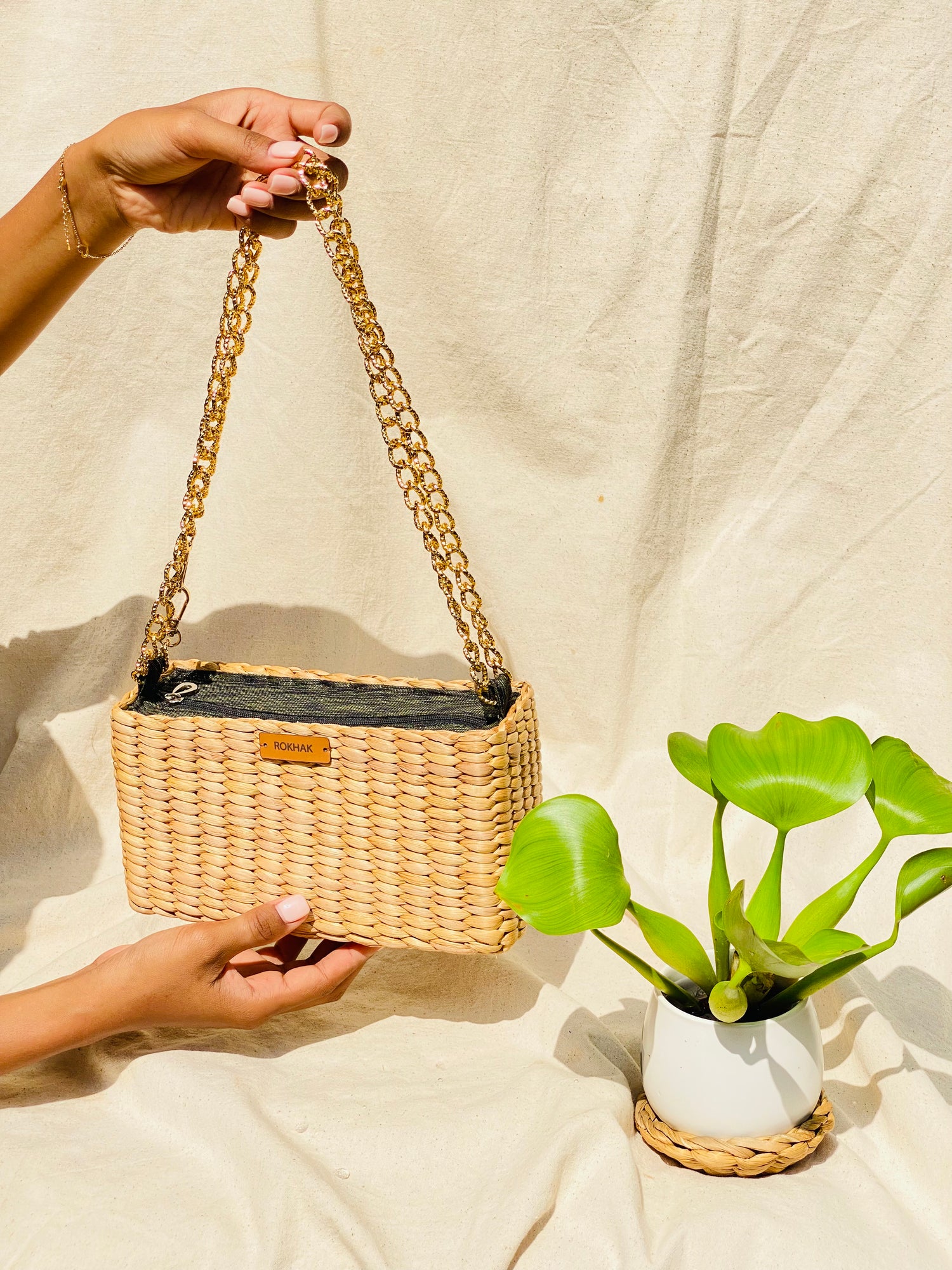 Confectionné à la main en jacinthe d'eau, plante aquatique récoltée et séchée à la main au Cambodge, tressée selon des techniques traditionnelles transmises de génération en génération, ce sac est créé par des femmes artisanes de Siem Reap, formées et soutenues par Rokhak, entreprise sociale cambodgienne fondée en 2016.